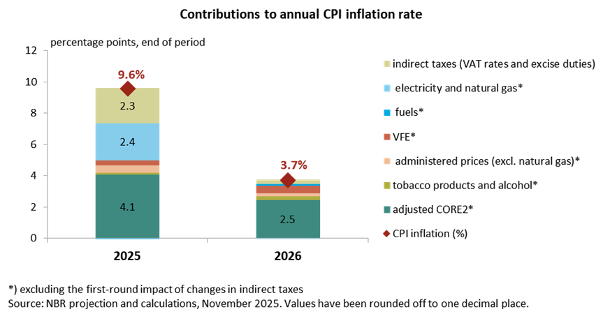 As set out in the graph below, the relevant estimates indicate that almost half of the current inflation rate is ascribable to changes in VAT rates and excise duties and to energy price rises. However, as of mid-2026, the inflation bout triggered by these determinants will drop out of the calculation of the annual inflation rate.
